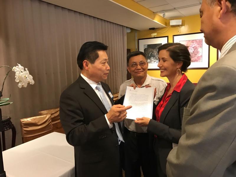美中友好城市代表团队向奥克兰市长递交2017武汉万勇市长的亲笔信和2017广州市长温国辉的亲笔信