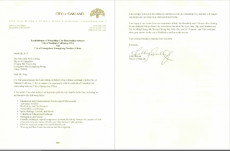 市长在文件中授权五名发起人代表美国加州奥克兰市,走访中国广州和武汉两市并签署相关协议。代表们到访时,会把文件正本亲手交给两地政府。